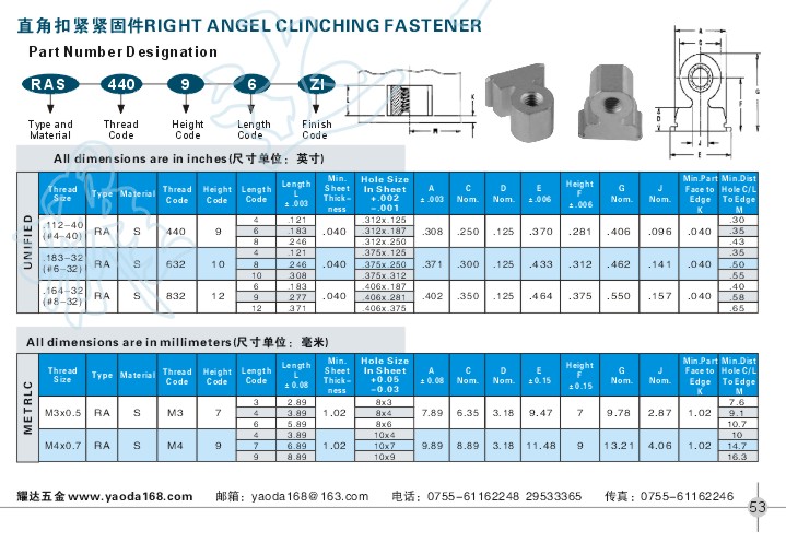 RAS 系列: Provides strong right angle attachment points in thin sheets (Rockwell B 60 Max. ). Type RAS fasteners are threaded and attachment is simply made using a standard screw.
