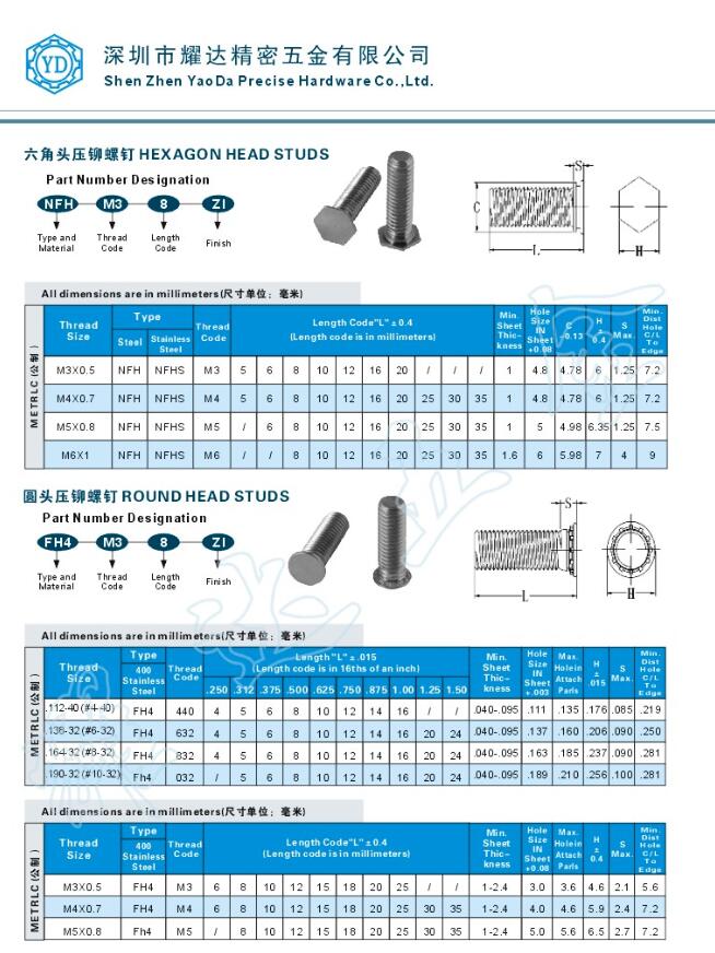 產(chǎn)品名稱(chēng):碳鋼壓鉚螺釘 不銹鋼壓鉚螺釘 產(chǎn)品型號: FH FHS 產(chǎn)品材質(zhì):碳碳鍍鋅 不銹鋼 SUS304 供應范圍:公制M3-M8 長(cháng)度6mm-35mm 圓頭的壓鉚螺釘頭部下方有一個(gè)齒紋的壓花設計,采用冷墩工藝成形,生產(chǎn) 速度和制造成本均比較低,安裝方式也較為快捷和簡(jiǎn)單。 使用時(shí)在基體上開(kāi)一 個(gè)略大于螺紋的小孔(具體尺寸要和壓鉚螺釘頭部下的齒紋壓花直徑相配合), 垂直放入后用鉚壓設備在產(chǎn)品的頭部平面均勻加壓即可, 壓緊后壓鉚螺釘頭部下方有傾斜角度的 壓花齒紋會(huì )和基體咬合形成一個(gè)永久牢固的螺紋。 壓鉚螺釘的材料多采用普通碳鋼或不銹鋼SUS304生產(chǎn), 其作用是要在一個(gè)很薄的鈑金件上形 成一個(gè)牢固的外螺紋。 公司為適應當前的 ROHS 環(huán)保趨勢 , 我們更多的還采用環(huán)保原料生產(chǎn)各種規 格的壓鉚螺釘以滿(mǎn)足需求 ,并且每批碳鋼壓鉚螺釘下線(xiàn)后都會(huì )熱處理。