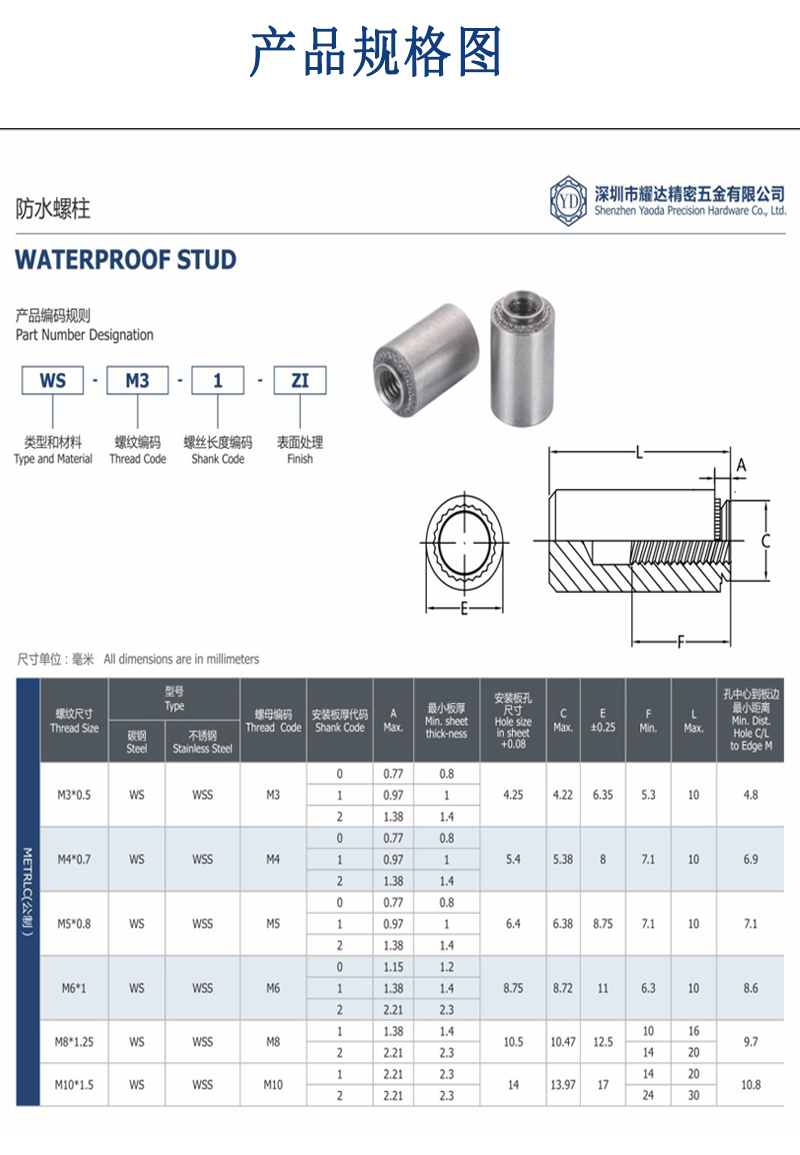 無(wú)臺階防水螺柱WS/WSS/B/BSS不銹鋼防水螺母柱