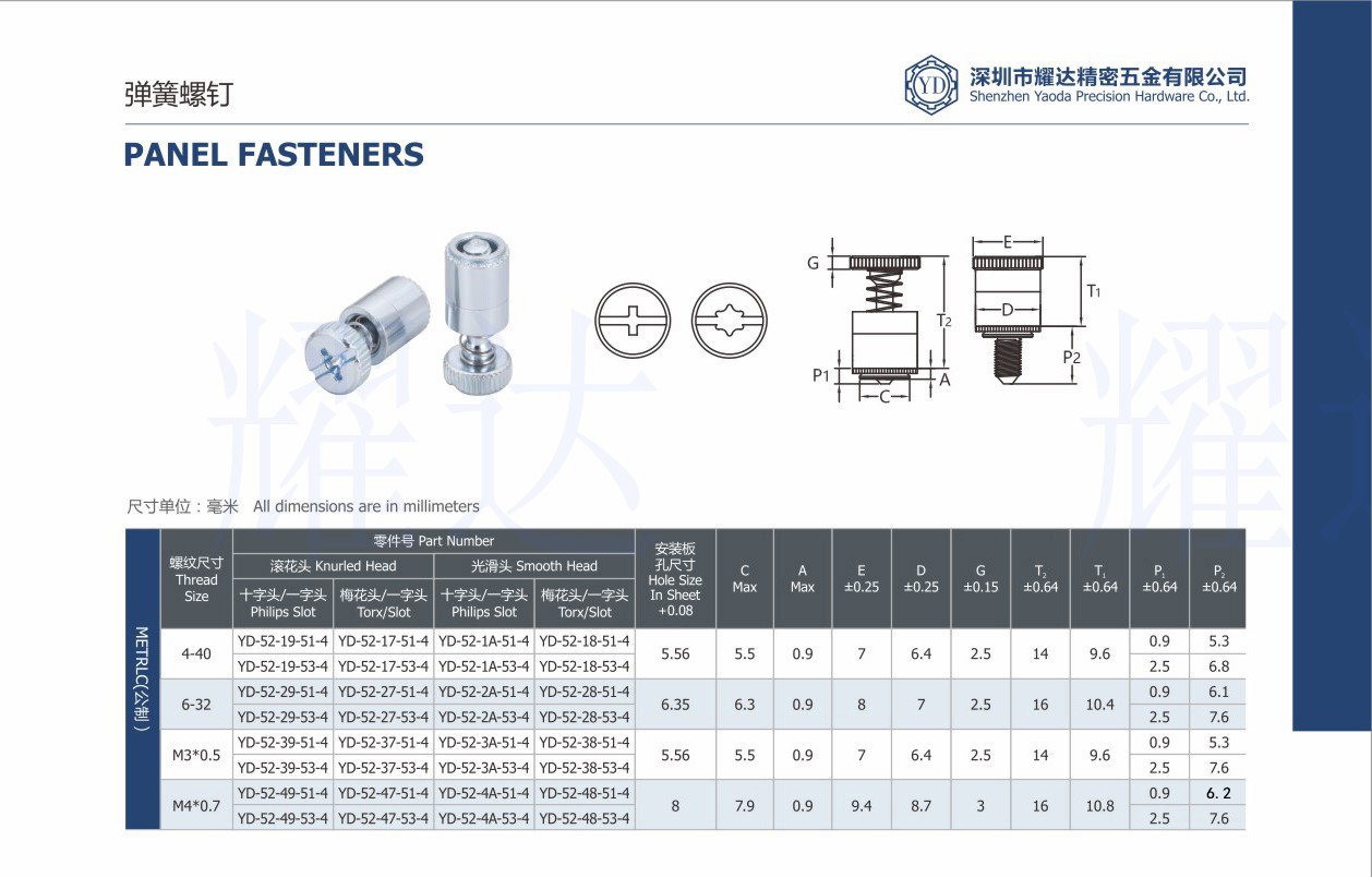 材料和表面處理螺釘:淬硬碳鋼,鍍鋅加密封鉚壓套:鋁,本色彈簧:300系列不銹鋼,鈍化 螺紋:M3 M4 #4-40 #6-32
