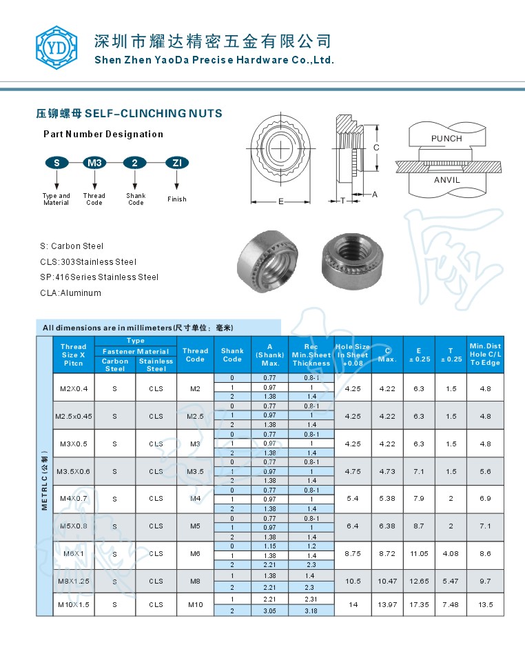 S,CLS,SP,CLA,YRN,壓鉚螺母,冷鐓壓鉚螺母,自扣緊螺母
