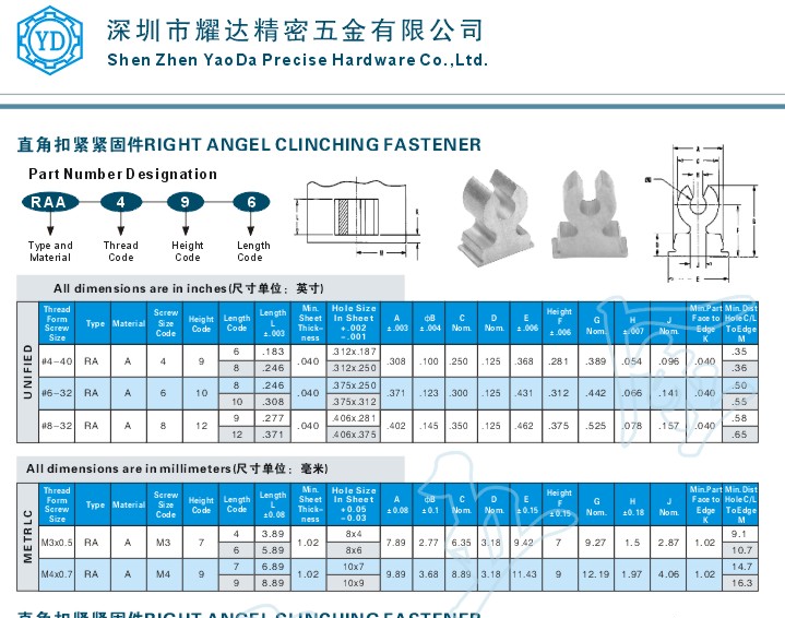 RAA 系列: Provides strong right angle attachment point in aluminum sheets as thin as. 040" / 1mm and Rockwell B 45 Max.