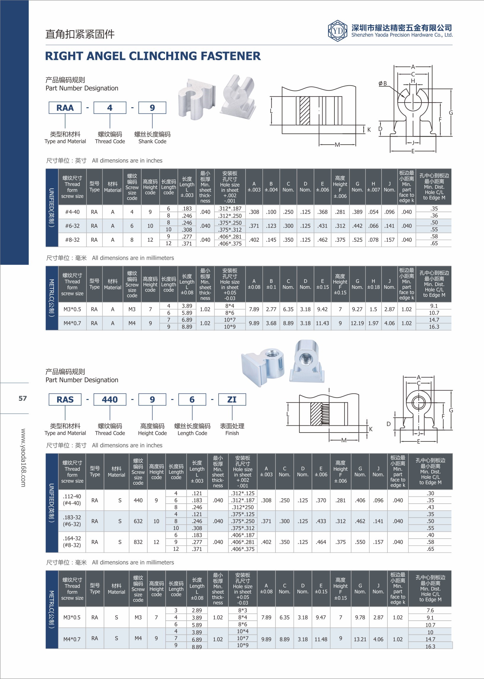 RAS 系列: Provides strong right angle attachment points in thin sheets (Rockwell B 60 Max. ). Type RAS fasteners are threaded and attachment is simply made using a standard screw.
